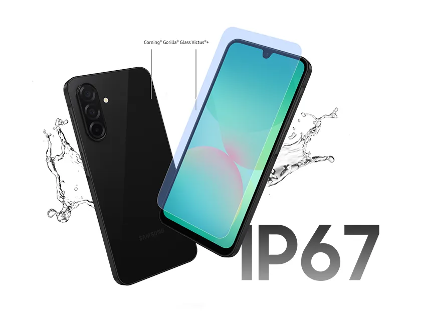 Galaxy A26 on rakennettu kestämään – se on valmistettu vahvasta Gorilla Glassista ja IP67-luokituksen mukaisesti vedenkestävänä seuraa sinua minne tahansa.