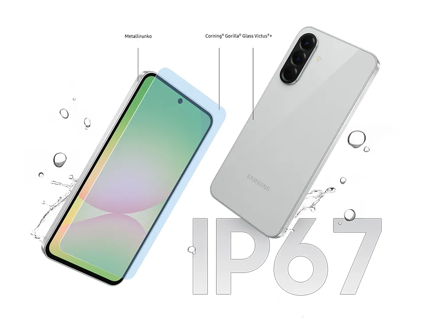Samsung Galaxy A56 on osa Suomen käytetyintä puhelinsarjaa. Se on luotettava ja rakennettu kestämään vahvasta Gorilla Glassista. IP67-luokituksen mukaisesti se vedenkestävänä seuraa sinua minne tahansa.